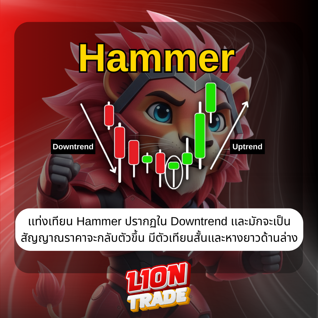 Hammer (แฮมเมอร์) เป็นรูปแบบแท่งเทียนที่ทำหน้าที่เป็น "สัญญาณบ่งบอกการกลับตัวของแนวโน้มราคา"